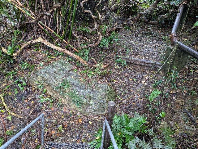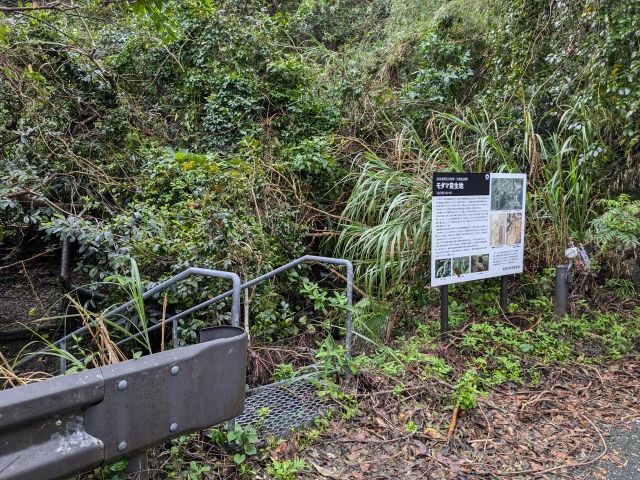 Googleマップに従い、それらしきポイントに到着。案内板とともに金属製の階段が設置されていました。