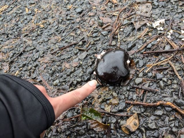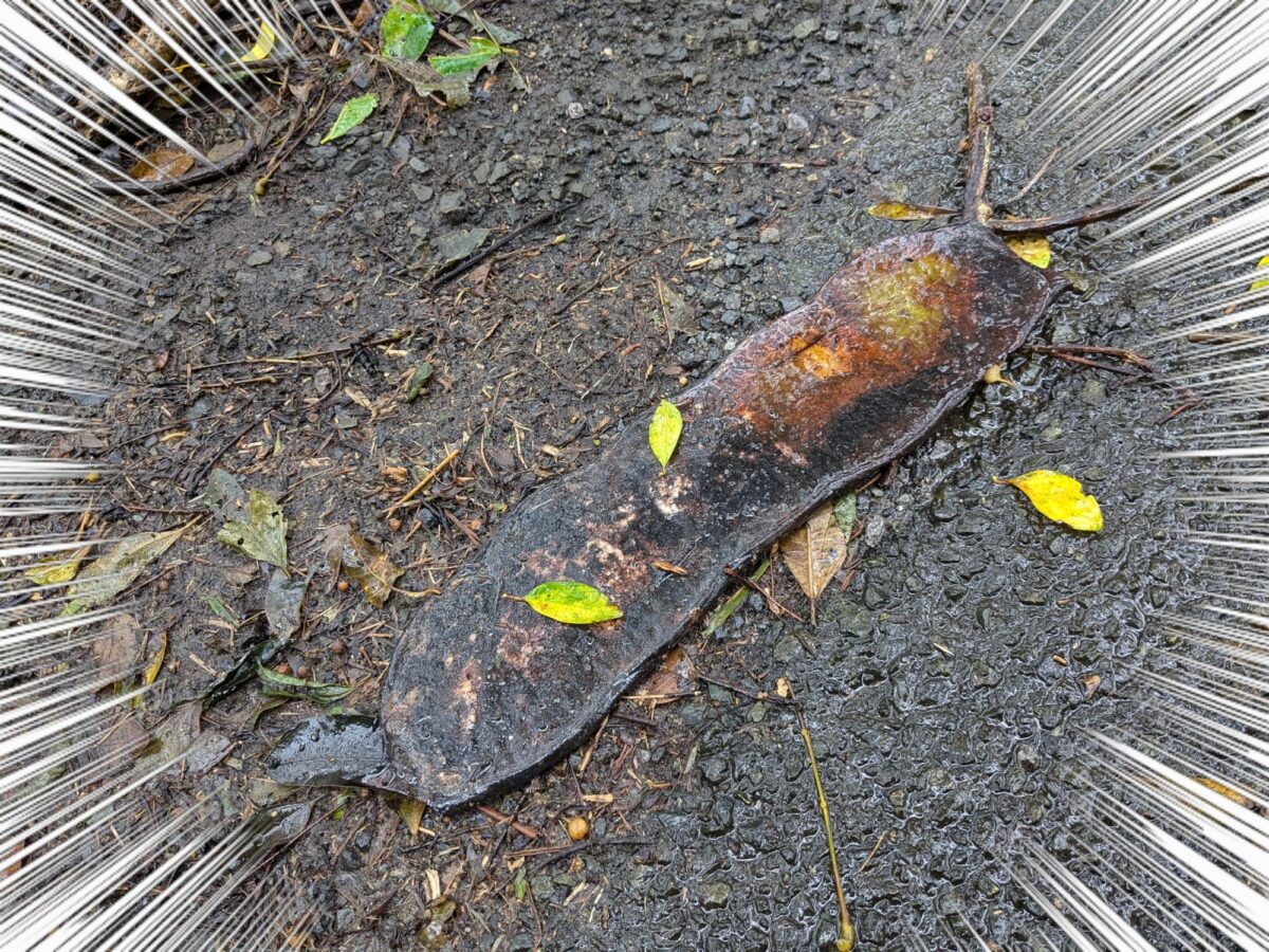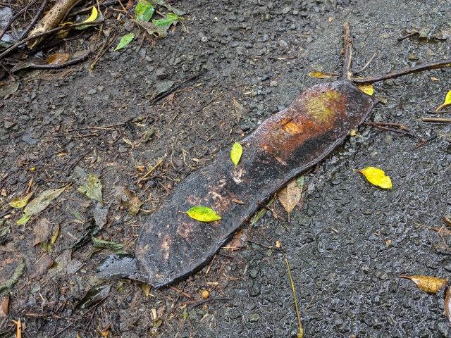 近くでは、落ちている豆の実も見つけました。かなり大きく、直径7cmくらい。ピンポン玉よりも大きいです。