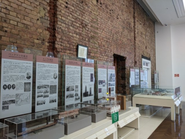 むき出しの赤レンガ壁の前には、赤レンガ棟の歩んできた歴史が記されたパネルや、実際に使用されていたレンガやレールなどの部品が展示されています。