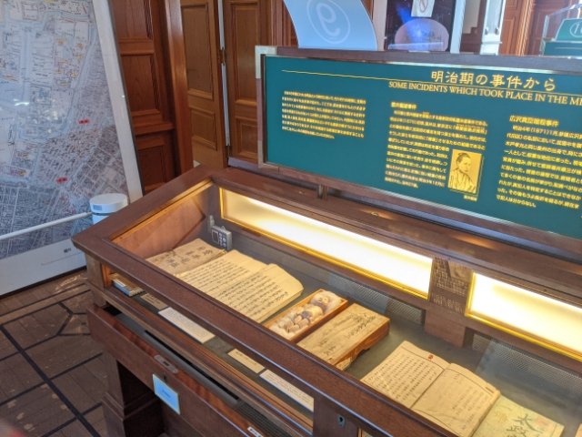 明治初期の事件の書類や新聞などが展示された「明治事件史コーナー」もあります。