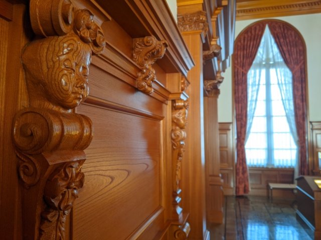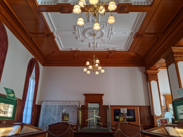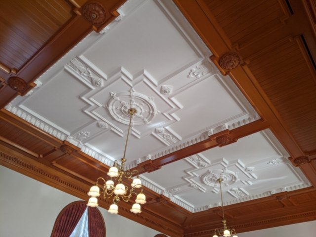 白亜の天井は照明を広く反射し、館内を明るくする。精巧な彫刻と、ツヤのある木材とのコントラストがとても美しいです。