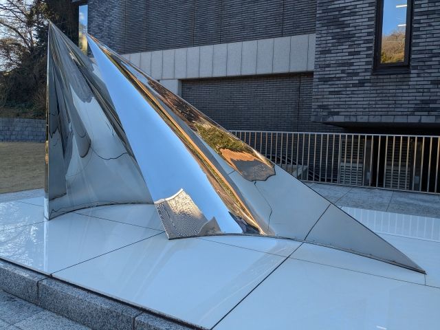 光を反射するメタリックな作品は《時空》by 多田美波。まるで光線のような躍動感で、周囲の風景とともに他の彫刻作品を映し出しています。