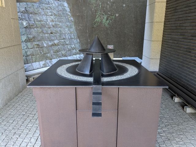 屋根のあるポイントに置かれている《静思空間》by 眞板雅文。円形のプレートを突き破る円錐、そしてその中央を抜ける道、まわりに敷かれた砂利。1年のうちある時期だけこの道を太陽の光が抜ける、そんな古代の信仰を感じさせる作品でした。
