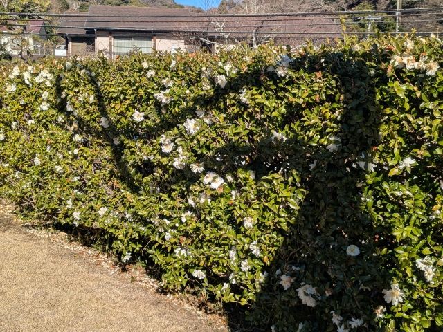 その名前から、もしかして影の方に意味があるのかも・・・。そう思い作品から伸びる影の部分を見ると、白い花を咲かせるサザンカの垣根にうねるようなシルエットが。時間帯によって変わる影こそが本体と考えると、動的な作品に感じられてきます。