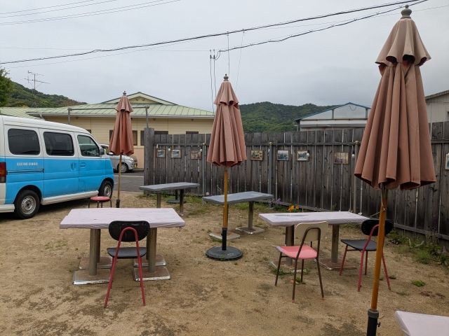 屋外席には自転車のスタンドも!2階席もありますが、午前中に雨が降っていたためか封鎖されていました。