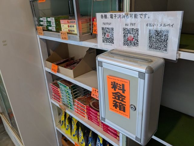ここは無人の売店。お金は料金箱に入れるか、PayPayなどのQR決済で支払います。