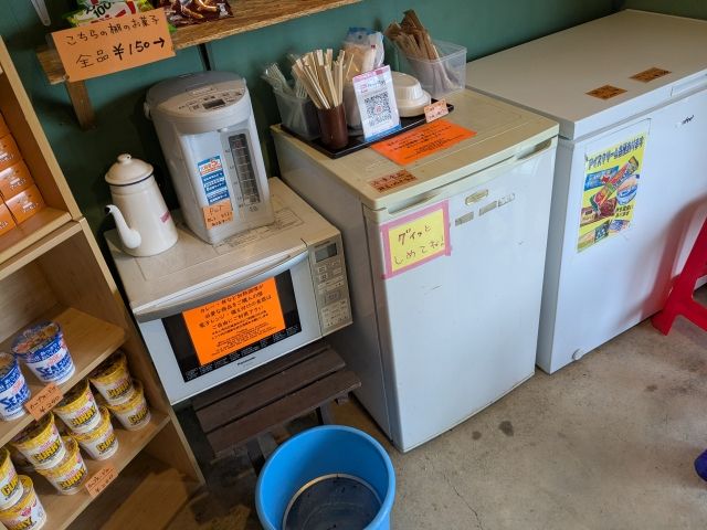 飲み物やお菓子、レトルト食品などラインナップは豊富。ポットと電子レンジもあり、さらにお箸、おしぼり、使い捨てのカレー皿、食べ残し用のバケツなどびっくりするくらい行き届いた設備。
