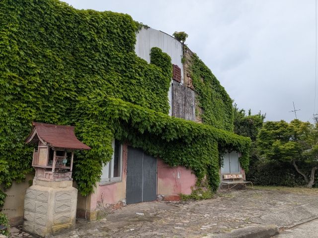 絡まるツタと錆びついた看板やベンチがただならぬ雰囲気のこちら、昭和36年(1961年)に建造された映画館・日章館(旧百島東映劇場 )
