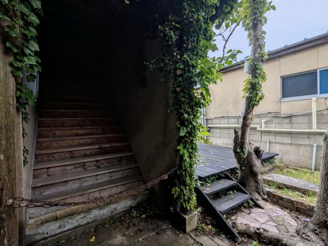 チェーンがかけられた階段。奥は真っ暗闇で、吸い込まれそうになります。