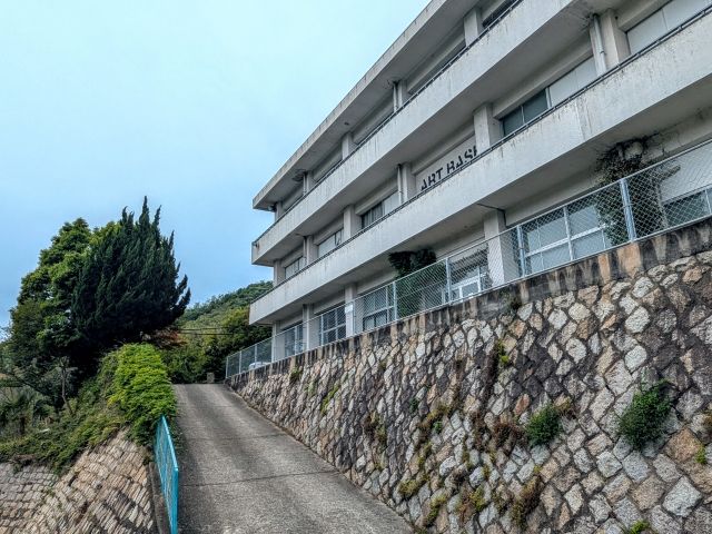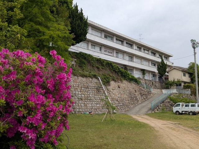 百島八幡神社のすぐ傍に建つ真っ白な建物。こちらは旧百島中学校舎。1999年に閉校しておりますが、2010年に現代美術作家の柳幸典によって改修工事がスタート。ART BASE MOMOSHIMAというアートセンターとして再活用がはじまりました。