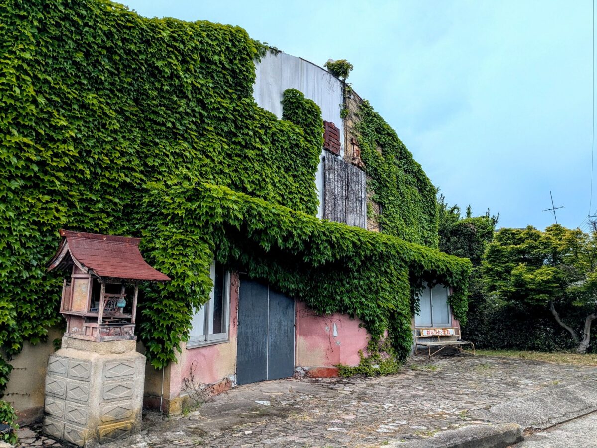 絡まるツタと錆びついた看板やベンチがただならぬ雰囲気のこちら、昭和36年(1961年)に建造された映画館・日章館(旧百島東映劇場 )