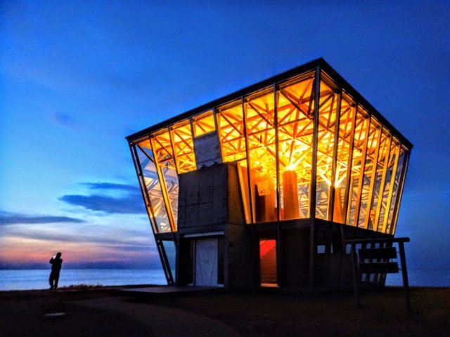 日没後に輝きを見せるのは、日の出岬にある展望台ラ・ルーナ。全面ガラス張りで、暖かい光が優しく海を照らします。
