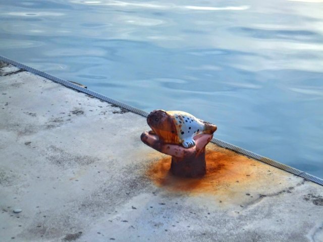 港のボラードの上にはちいさなアザラシ!少々錆びついていますが、まんまるでとってもかわいらしい。