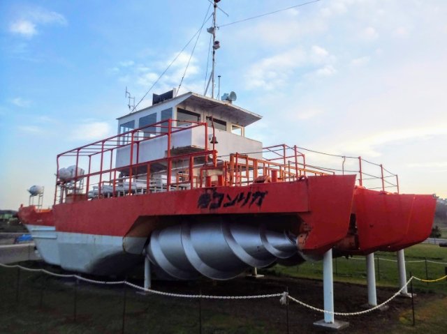 港周辺には、初代ガリンコ号も展示されています。地上に揚がっているため、船体の下に備えたドリル「アルキメディアン・スクリュー」もじっくり見学できます。