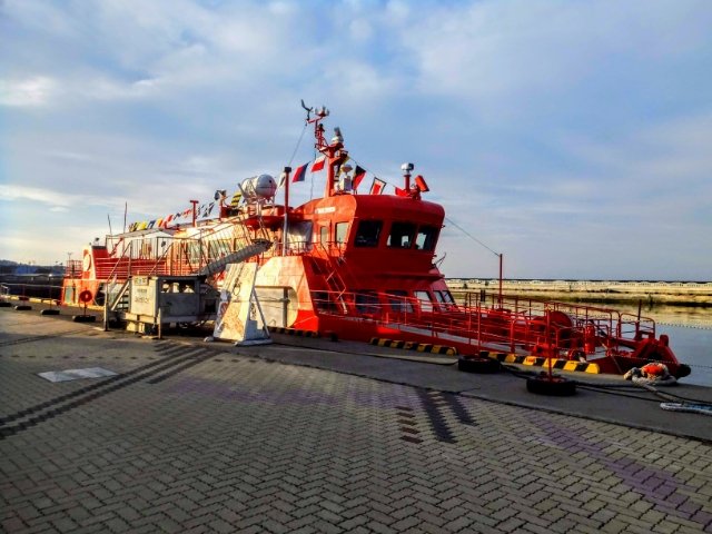 観光案内所の前に停泊しているオレンジ色の船は、流氷破砕船ガリンコ号Ⅱ。流氷シーズンにはガリガリと流氷を砕いて進むダイナミックなクルーズへと連れていってくれるたのもしいヤツです。