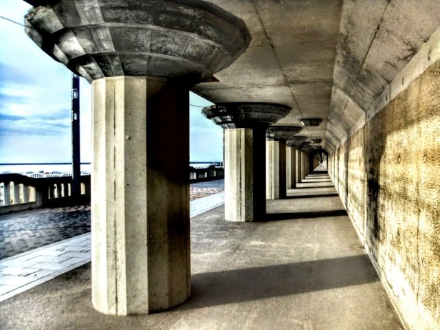 まるで神殿のような柱が並ぶ歩道。遺跡のような雰囲気抜群の通路です。こちらの防波堤は、通称クリオネプロムナードというそうです。