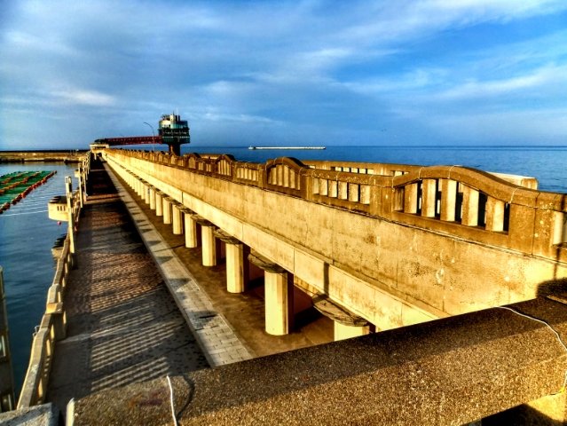 とにかく目につくのは、港からスーッと延びる防波堤。2段構造となっており、下段は車が走行できるくらい幅が広いです。スピーカーからはBGMが流れているのですが、たまたま流れてきたのは「パイプライン」。ベンチャーズのサーフサウンドが海っぽくて良く合います。