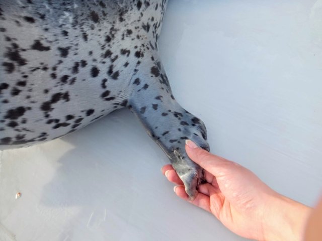 は、はじめてアザラシと握手しました!!歩き回ってるからツメは丸くなってます。痛くありません。