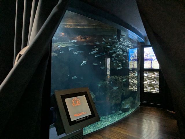 黒幕に包まれているのは深みの魚水槽。薄暗い照明の中、ヒメマス、オオクチバス、ブルーギル、ニゴイなどが泳いでいます。ポピュラーなサカナばかりですが、深い青の中を静かに泳ぐ様子は神秘的。