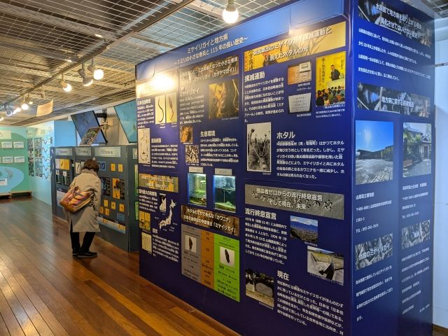 ミヤイリガイは「日本住血吸虫」という寄生虫の中間宿主であった生物。貝の内部で成長したあと、水中に遊出し、哺乳類の皮膚を破って体内に侵入。感染されると、やせ細り腹が膨れていき、やがて肝硬変や脳疾患にかかり命を落とすことになる日本住血吸虫症を引き起こします。この病は地方病と呼ばれており、明治時代に山梨県の甲府盆地で蔓延していました。ここでは、そんな歴史がパネルで紹介されています。
