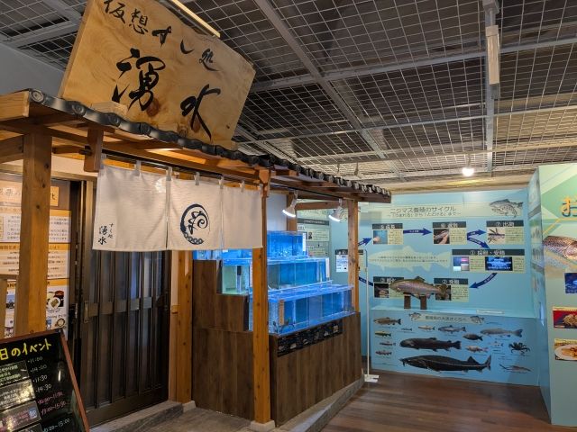館内にはこんな展示も!ここは仮想すし処「湧水」。趣ある門構えが作られており、入口前の水槽にはウナギ、モクズガニなど食べられる生き物が飼育されています。周囲は「おいしい水族館」と題されたコーナーで、ニジマスの養殖や加工などがわかりやすく解説されています。お腹が空いてきました。