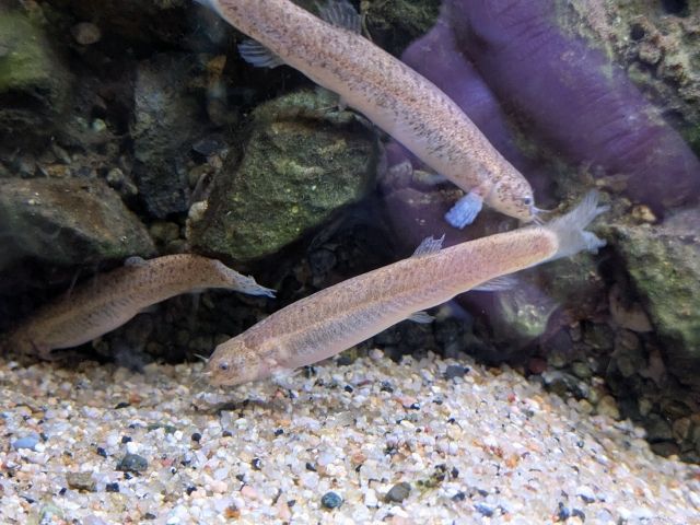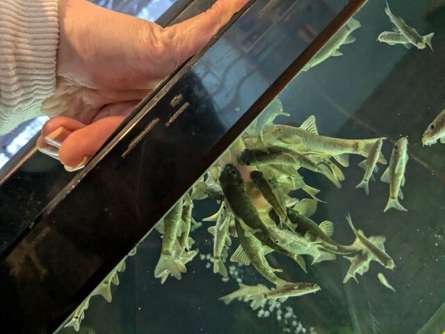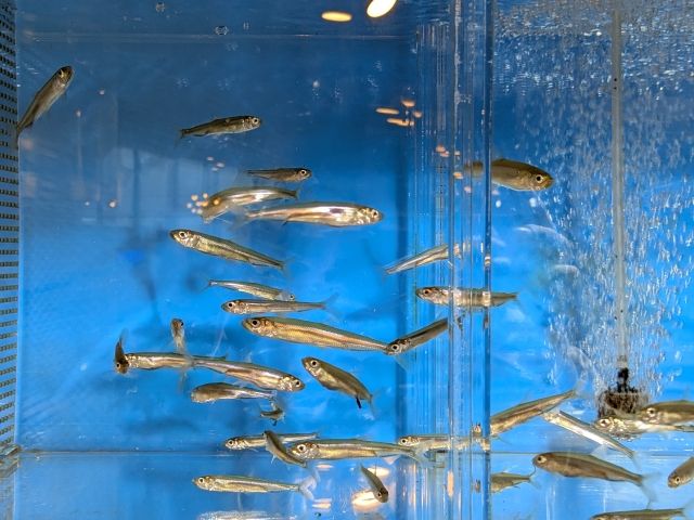 こちらはご存知ワカサギ。冬の風物詩「ワカサギ釣り」として良く知られるサカナですが、実は飼育している水族館はけっこうレア。水温調整や餌付けは難しく、そもそも入手するのがなかなかハード。ここでは山中湖や河口湖で丁寧に釣り上げた個体を運んで飼育しているそうです。