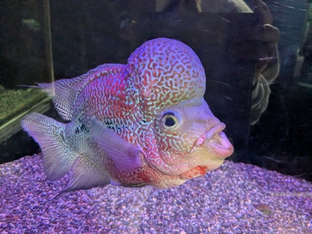 カラフルなフラワーホーン。南米あたりにくらすサカナかと思いきや、人工的に掛け合わされて造られたため自然下には存在しないそう。このサカナ、めっちゃ人懐っこい!目の前で手を動かすと追いかけてくるため、まるでじゃれているかのような動きを見せてくれます。