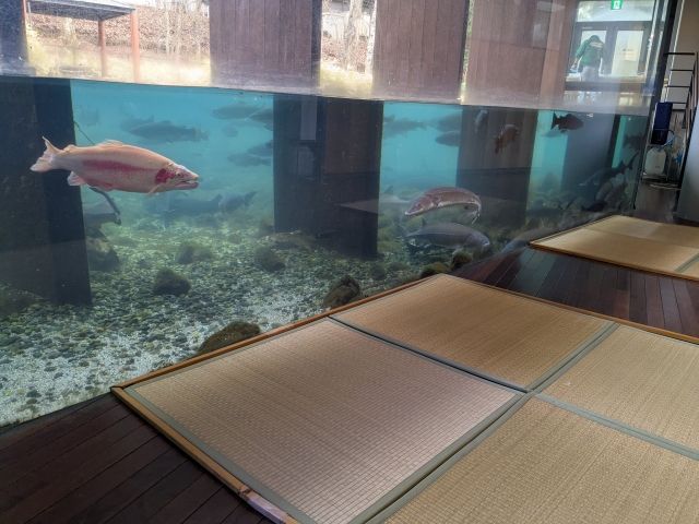 コンパクトな館内ですが、ユニークな展示が多数!一角では畳が敷かれており、靴を脱いでくつろいで見ることができます。アルビノニジマスやベステルチョウザメが泳ぐ姿をのんびりと観察してみましょう。