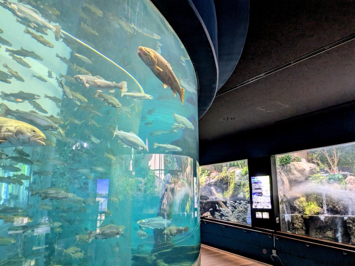 この水族館で最大の水槽が「二重回遊水槽」。ニジマスやブラウントラウトなど、約3,000匹もの魚達が泳いでいます。水の流れがあるのですが、みな流れに逆らって泳ぐサカナ。そのため、ほぼすべてのサカナが同じ向きで泳いでいます。