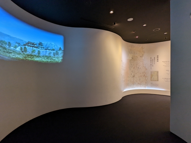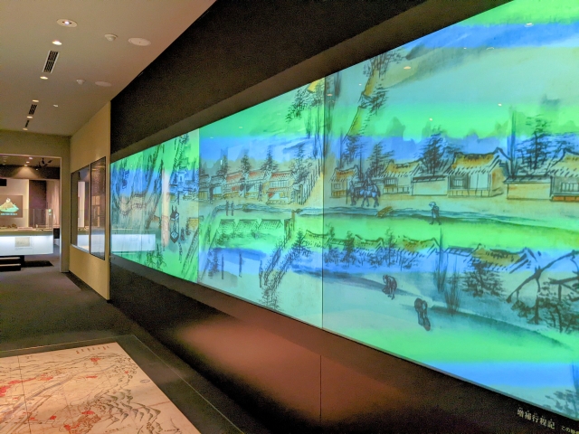 こちらは1751年に記された江戸から盛岡にいたる奥州街道の風景を描いた「増補行程記」を元にした城下町絵巻シアター。デジタル化されており、人々が動く様子やにぎわいの声が聞こえてきます。