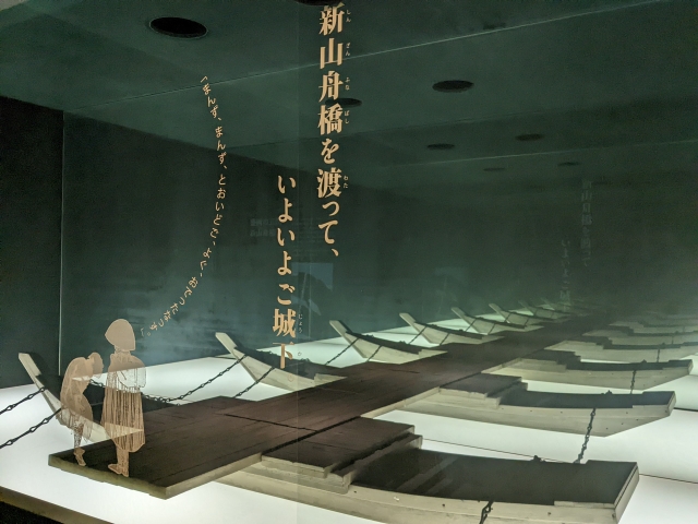 たくさんの舟が連なり、その上には板が敷かれています。こちらは舟を並べてつくった「舟橋」。北上川の新山河岸と仙北町を結ぶ箇所に架けられており、新山舟橋と呼ばれていました。ここでは立体模型と鏡を使って、長く繋がる舟橋が再現されています。