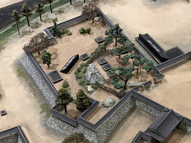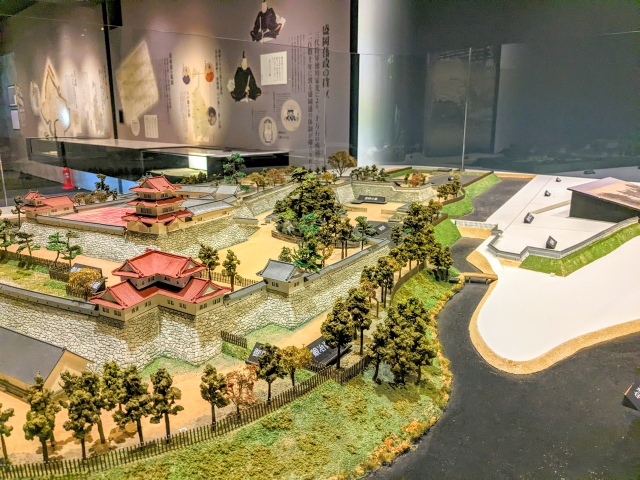 盛岡城の模型も見どころの一つ。中津川に面して広がる城郭がミニチュアで再現されており、在りし日の姿を俯瞰で見ることができます。天守閣はありませんでしたが、本丸には立派な三重櫓が建てられています。