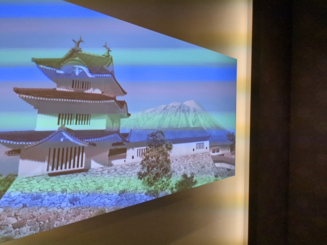 CGシアターでは、岩手山をバックにそびえる美しい盛岡城。盛岡城跡へ行く予定の方は、ここを見てから巡るとよりイメージしやすそうですね。