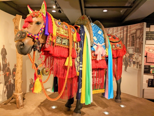 となりに佇むド派手なお馬さんは「チャクチャグ馬コ」。華やかな装飾をまとった馬に稚児を乗せて進むお祭りで、毎年6月に開催されています。名馬の産地として知られる岩手ならではの祭りです。