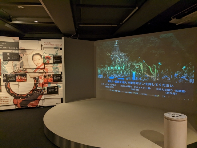 シアターでは「盛岡さんさ踊り」の映像が流れています。盛岡さんさ踊りは誰でも参加できる夏祭りとして1978年にスタートした夏祭りで、「サッコラチョイワヤッセー」という掛け声とともに繰り広げられます。熱気あふれる踊りや、それに向けて準備を行う様子がドキュメントタッチで描かれており、ついつい見入ってしまいます。