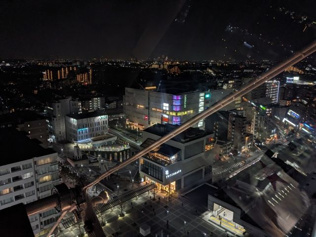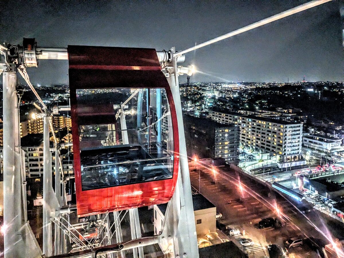 一周は約12分、高度が上がるにつれて少しずつ変わりゆく景色を楽しむことができます。南東を見ると、遠くにみなとみらいの明かりが見えます。天高くそびえる横浜ランドマークタワーが目印です。