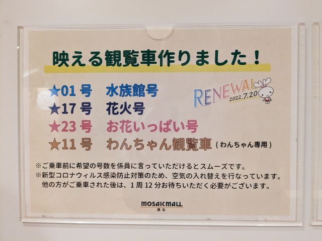 受付に貼られていたのは「映える観覧車作りました!」の貼り紙。「水族館号」「花火号」「お花いっぱい号」「わんちゃん観覧車」と全部で4つの特別ゴンドラがあります。