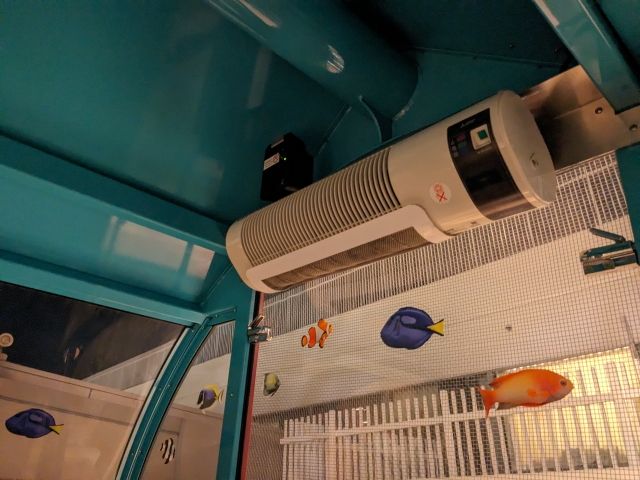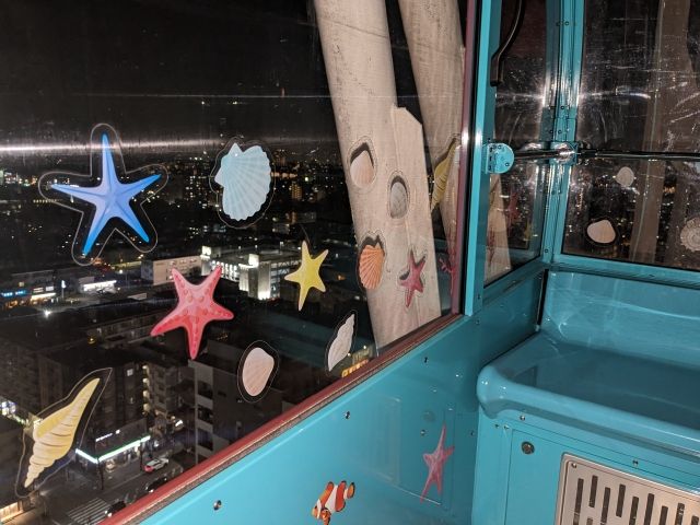 今回は他にお客さんもいなかったので、「水族館号」にしてもらいました!ゴンドラ内には、色鮮やかな熱帯魚や貝・ヒトデがたっぷり貼られています。上空でサカナを見るのも不思議な気分でした。