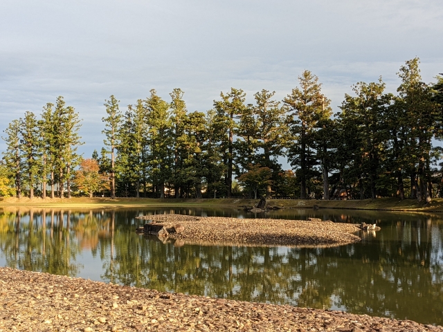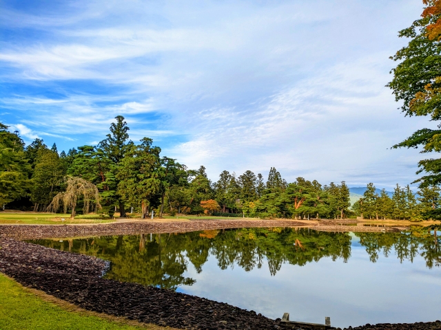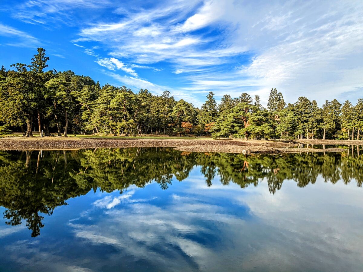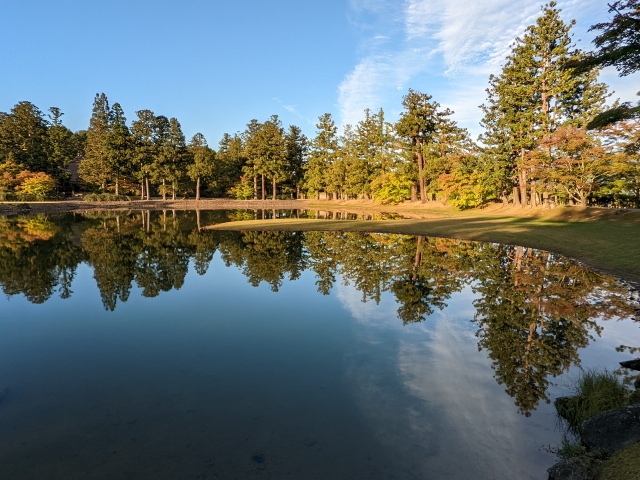 東西約180m、南北約90mという大規模な池は、鏡のように空を映します。周囲は曲線で造られているため、見る角度によって印象が変わってゆく。どこから写真に撮るのが良いか探しながら、池を一周してみるのも楽しいです。