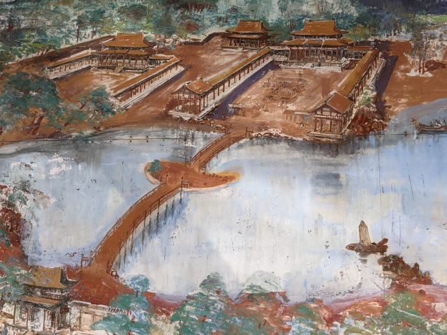 池の中央に浮かぶのは中島。かつてはこの島に橋が架けられていたそうです。そして、その橋の向こうには中心伽藍であった金堂円隆寺をはじめ様々な諸堂が広がっていました。