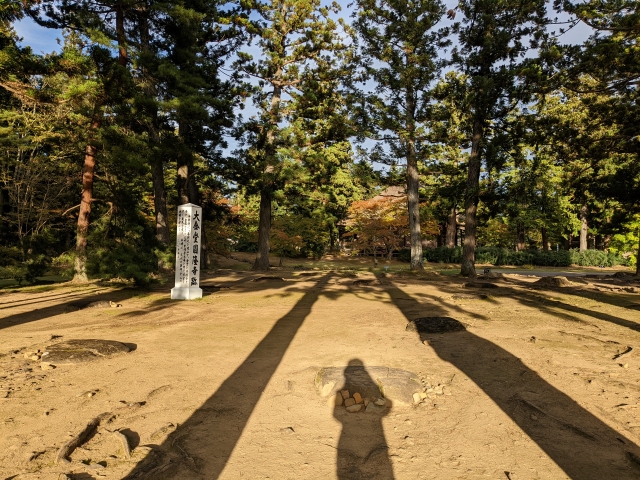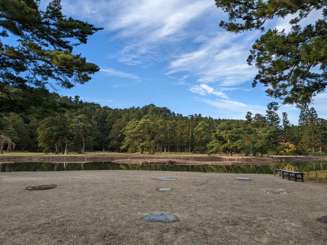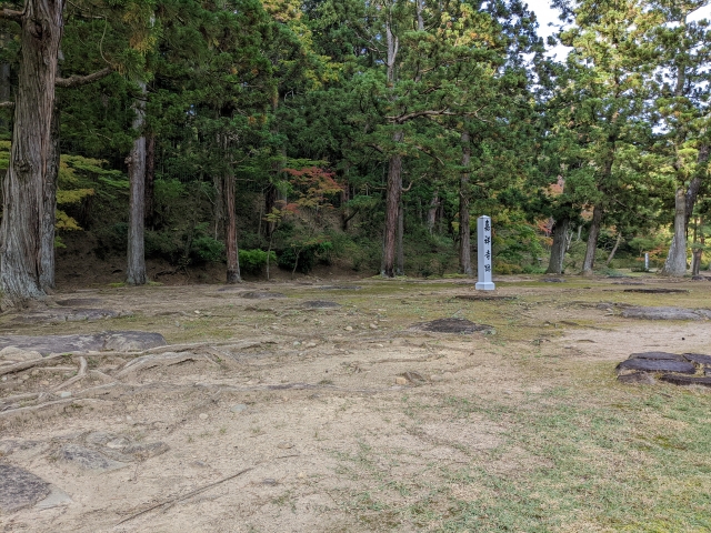 こちらが金堂円隆寺跡。残っているのは礎石だけですが、その規模の大きさは感じ取ることができます。想像力が豊かな方は、振り返って大泉が池を眺めると、両側に広がる翼廊が見えてくるはずです・・・!