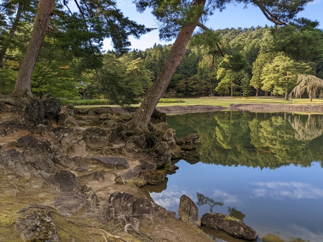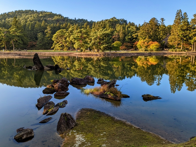 手前の石は出島を、池に浮かぶ立石は周りを小石に囲まれており荒磯の風情を表しているそう。今日は天気が良いのでそれほどではありませんが、曇りや雨の日に見ると、迫力が増すのでは。