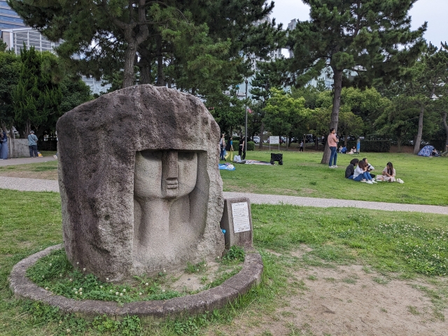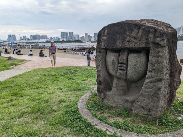 意外と有名でしょうか?お台場海浜公園にもモヤイがいます。マリーンハウスのすぐ近く、周辺には海を見ながらくつろぐ多数の人々が。