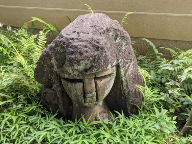 他のモヤイとはちょっとタイプが違う、まるで仮面のような姿。「これ本当にモヤイ像なのでしょうか・・・?」と少し不安になりましたが、しっかりと案内板もあります。