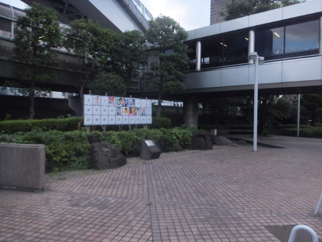 JR浜松町駅の南口を出て歩道橋を進んだ先、東芝浜松町ビルのそばにある小さな公園。ここにもモヤイ像がいるとの情報があったので向かってみました。訪れた日曜日、頭上の首都高速都心環状線は多数の車が行き交っていますが、歩道を歩いている人は一人もいません。