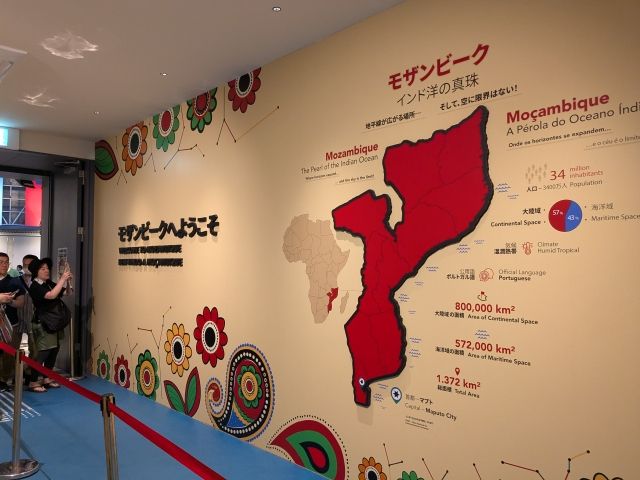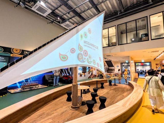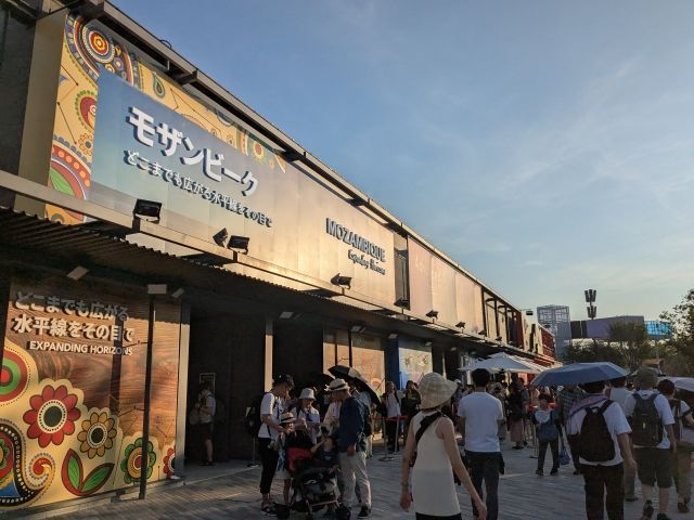 万博2日目の日曜日、日も暮れて園内も落ち着いてきた中で訪ねたのはモザンビークパビリオン。「どこまでも広がる水平線をその目で」というメッセージが目を引きます。入館待ちの列はナシ、というか館内もほとんど人がいません。