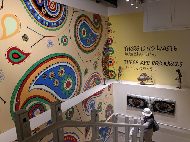 1階と2階をつなぐ階段にはペイズリーのような勾玉模様に加えて「THERE IS NO WASTE THERE ARE RESOURCES(無駄はありません リソースはあります)」の文字。強いメッセージ性を感じます。