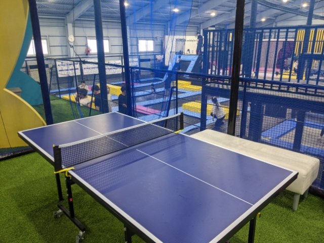 他にもボルダリングゾーンや競技用トランポリン&クリアウォール、お手軽なジップラインなど盛りだくさん。そして、なぜか卓球も置かれていました・・・!しかもかなりのミニサイズ。スピーディーな戦いになりそうです。