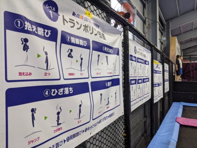 大人になってからはじめてのトランポリン。ぼよんぼよんとただ飛び跳ねるだけでも楽しいのですが、壁を見ると「ひざ落ち」や「抱え飛び」などいろいろな小技が記されています。これに挑戦してみるのも楽しいです!
