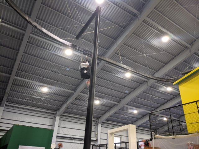 専用のハーネスでしっかりと固定したあとは、パーク内で遊ぶ人たちの上空をぐるりと空中散歩。けっこうな高さですが、コワイ感じはなく爽快です。